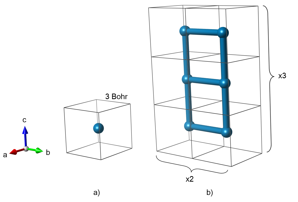 Fig. 1: Primitive unit cell (a) and 1x2x3 supercell (b) that represent a cubic lattice of hydrogen atoms.