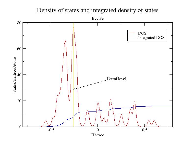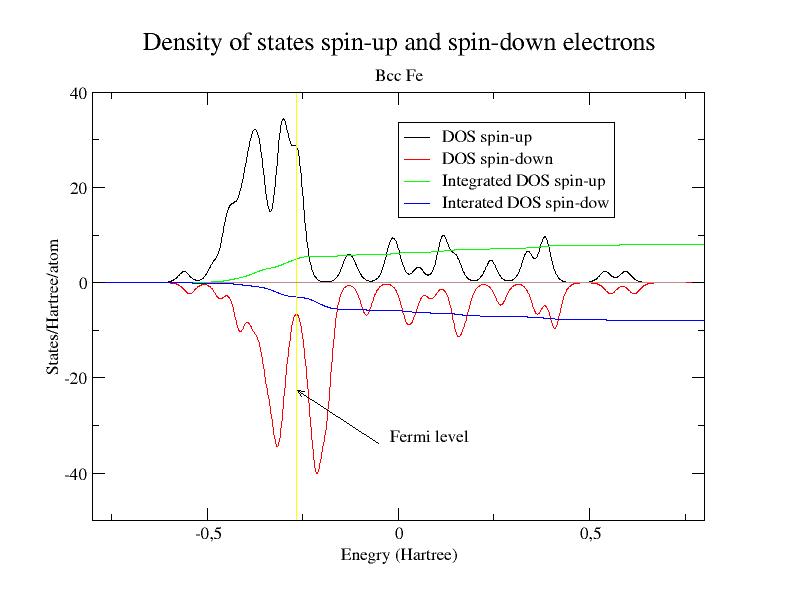 we observe that the up and down DOS have been “shifted” with respect each other. The integrated density of states yields the number of electrons for each spin direction, and we see the magnetization which arises from the fact that there are more up than down electrons at the Fermi level.