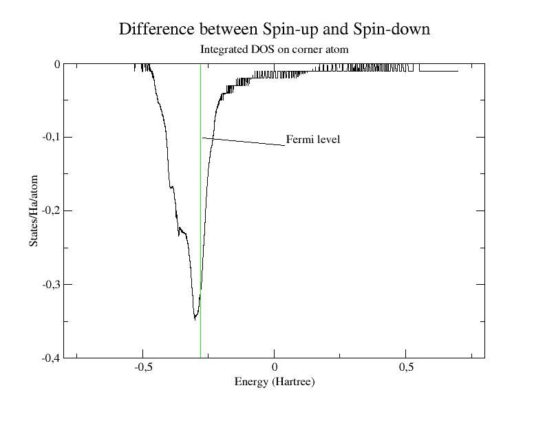 There are apparently changes in the densities of states for all the channels, but besides the d-channels, these are indeed fluctuations. This is confirmed by looking at the integrated density of states which is different only for the d-channel. The difference between up and down is 0.68, in rough agreement (regarding our very crude methods of integration) with the previous calculation. Using a calculation with the same number of k-points for the projected DOS, we can plot the up-down integrated dos difference for the d-channel.